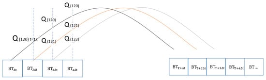 To calculate the overall heat transferred by the droplets to the slag, it is required to consider the total count of droplets at each instant of time. With the droplet generation rate and size distribution, the total number of droplets for each class can be calculated. However, at each instant of the blowing time the droplets generated from the previous time steps also transfer heat with the surrounding. A schematic diagram to understand the overall droplet heat transfer calculation for an ejected droplet diameter of a single class is shown in Figure 4. The time step for the blowing period in Figure 2 is taken as 1 s and the time step to calculate the droplet velocity is 0.001 s. It is assumed that the calculation starts from a blowing period of 2 min (120 s).