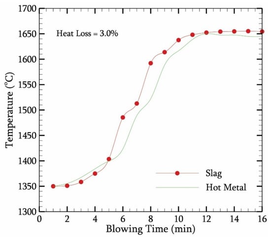 - From a heat balance study [32] by the current authors, it was observed that the overall heat loss percentage varies from 2% to 6%. Since heat loss affects the temperature, it is assumed that the an average heat loss value is 3% throughout the blowing period and it happens from the slag zone.
