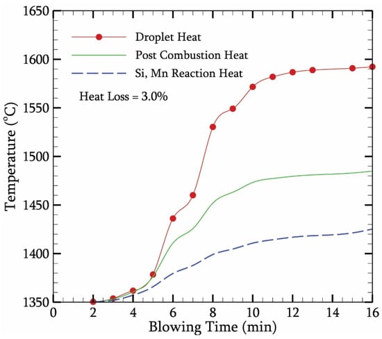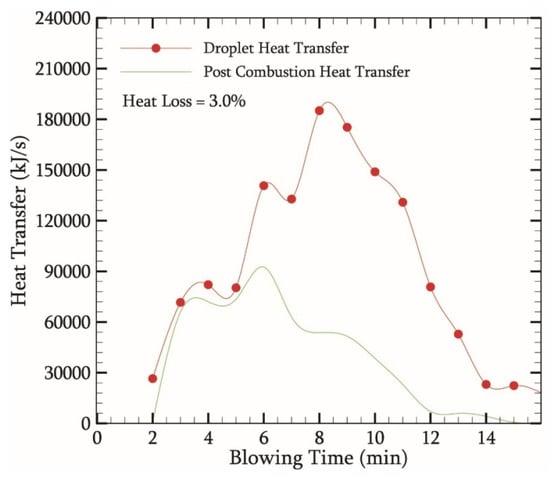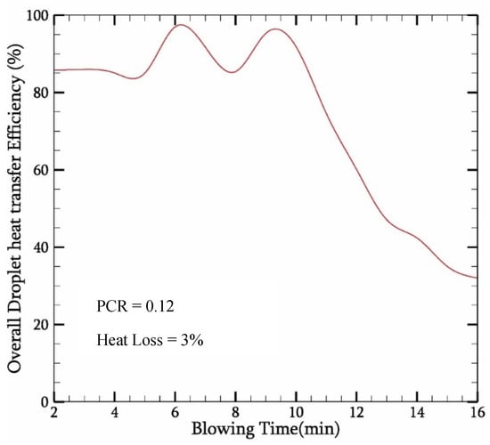 The droplet heat transfer efficiency is a function of droplet residence time in slag. The residence time of droplet generated varies from 20 to 80 s. An increased residence time allows more time for droplets to interact with the slag. The increased residence time is due to the de-C reaction that generates CO gas within the droplets. Once the blowing time crosses 11 min, the rate of de-C decreases. Thus, the residence time of the droplets decreases. The droplet heat transfer efficiency is defined as the heat transferred by the droplets to the slag to the total heat transferred by droplets (to slag and hot metal). Therefore, an increased residence time in the first half of the blow allows for more heat transfer, resulting in higher overall droplet heat transfer efficiency, as shown in Figure 11. In other words, the effect of the slag being heated up by the droplets will be more than the droplets heating the hot metal. However, near the end of the blow, the droplets’ heat transfer to the slag drops due to the decreased residence time of the droplets. Therefore, the overall droplet heat transfer efficiency decreases towards the end of the blow.