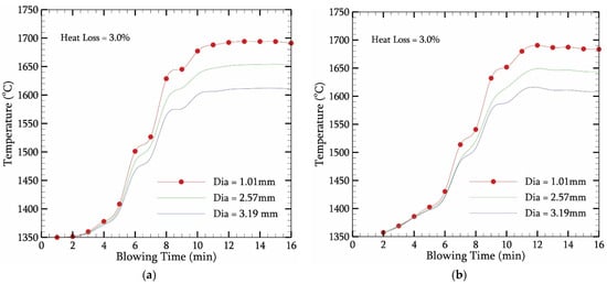 In a BOF, the generated droplet diameter varies from 0.23 mm to 3.35 mm. The diameter and count of the droplet generation influence the refining action. Likewise, the heat transfer is also affected by the size of droplets. As a preliminary step to understand the effect of global droplet heat transfer, the present study assumes that all the droplets generated are of the same size. Figure 10 gives the effect of droplet diameter on slag temperature. With the increase in droplet size, the effect of heat transfer is reduced, resulting in the slag temperature to decrease (as shown in Figure 10a), which in effect decreases the hot metal temperature (as shown in Figure 10b). This is due to the fact that the effective surface area generated by smaller droplets is greater than the larger droplets. Therefore, in further studies, the distribution of droplets will be accounted for to precisely understand the effect on slag temperature due to global droplet heat transfer.