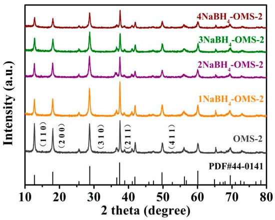 Figure 1 shows the XRD patterns of OMS-2 and OMS-2 treated with NaBH4 concentrations of 4 mmol/L, 8 mmol/L, 12 mmol/L and 15 mmol/L. The sodium borohydride solution here is alkaline, because H− in BH4− combines with H+ to generate H2 in an acidic medium. The reaction of H+ and H− is affected by pH. The alkaline medium contains a large amount of OH−, while the H in NaBH4 is −1, which can only be used as a reducing agent. It can be seen that OMS-2 has a 2 × 2 tunnel structure. It can correspond to the standard card of α-MnO2 (JCPDS NO.44-0141, the space group is I4/m), indicating that OMS-2 can be prepared by this simple hydrothermal method []. Analysis of the spectrum can be obtained, and the xNaBH4-OMS-2 obtained by different concentrations of the sodium borohydride treatment all maintain the structure of manganese oxide octahedral molecular sieve. Through the comparison of diffraction peaks 12.78°, 18.10°, 28.84°, 37.52°, 49.86°, etc., all of them match the crystals of (110), (200), (310), (211), (411) crystal plane of α-MnO2. The diffraction peak intensities of 1NaBH4-OMS-2, 2NaBH4-OMS-2 and 3NaBH4-OMS-2 decreased slowly after the sodium borohydride treatment, while the diffraction peak intensity of 4NaBH4-OMS-2 decreased significantly. This is because the sodium borohydride concentration is too high, resulting in serious damage to the structure of the surface of the material, so the crystallinity of the material is greatly reduced.