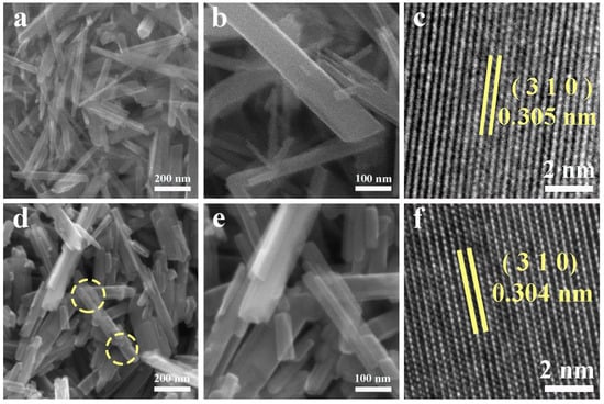 The microscopic morphologies of OMS-2 and NaBH4-OMS-2 can be characterized by scanning electron microscopy. Figure 2a,b shows the SEM images of OMS-2, showing nanorod-like morphology. OMS-2 has a diameter range of 30–90 nm and a relatively uniform length of about 500 nm. At the same time, the surface of the material is uniform and the crystallinity is high. Figure 2d is the SEM image of the 2NaBH4-OMS-2 sample. The sample treated with sodium borohydride maintains the nanorod shape as a whole, and the diameter and length are not much different from those before treatment, and there is no complete breakage. But a layered structure appeared on the surface of the nanorods, and the tips were thinned, as indicated by the yellow circles. To further illustrate the grain size and particle size of the material, XRD grain size analysis and TEM grain size distribution analysis were carried out. The XRD data were processed by Jade software and Scherrer formula, and the grain size of the obtained material was 17.0 nm. The TEM particle size distribution is shown in Figure S1. The particle size distribution map reflects the diameter distribution of the material between 30–90 nm, with less small size distribution. But the surface of the nanorods is no longer flat. The 2NaBH4-OMS-2 sample was further magnified and observed, as shown in Figure 2e. The treatment of sodium borohydride made the surface of the nanorods no longer smooth, a layered structure appeared, and the tips were thinned. At the same time, concave structures appear on the surface, which are all due to the reduction treatment of sodium borohydride. The composition of OMS-2 did not change before and after the sodium borohydride treatment. Figure S2 shows the EDS spectrum of 2NaBH4-OMS-2, and no other impurity elements appear in the sample after treatment. This is due to the short treatment time of sodium borohydride and the sufficient centrifugal washing after treatment.