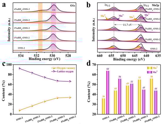 Due to the reduction effect of sodium borohydride, low-valence manganese is generated on the surface of the material, and oxygen vacancies are generated according to the principle of electrostatic equilibrium. Oxygen vacancies act as cations, balancing the surface charge of the material. Tests show that the sodium borohydride treatment is a reliable method to improve the surface structure of the materials and generate oxygen vacancies (Figure S4). Figure 4a is the XPS spectrum of O 1s; the peaks at the binding energies of 531.6 eV and 529.9 eV are attributed to oxygen vacancies (O2) and lattice oxygen (O1), respectively. With the increase in the sodium borohydride concentration, the oxygen vacancy content increased significantly. It can be seen from Figure 4b that the distance between the two peaks of Mn 2p1/2 and Mn 2p3/2 is 11.7 eV, indicating that the manganese in the manganese oxide before and after the treatment exists in both trivalent and tetravalent forms. However, to accurately determine the specific valence state of manganese in the material, it is also necessary to combine the XPS peak analysis. The 2p3/2 and 2p1/2 spin-orbit peaks of Mn3+ and the 2p3/2 and 2p1/2 spin-orbit peaks of Mn4+ were further identified, corresponding to 641.2 eV, 653.2 eV, 642.4 eV and 654.1 eV, respectively. With the increase in the treatment concentration, the content of Mn3+ increases gradually, and the content of Mn3+/Mn4+ also increases accordingly. To more clearly characterize the change of oxygen vacancies, the relative content of oxygen vacancies was calculated (Figure 4c). When the concentration of sodium borohydride is too high, the destruction of the surface structure of the sample results in no further increase in the content of oxygen vacancies.
