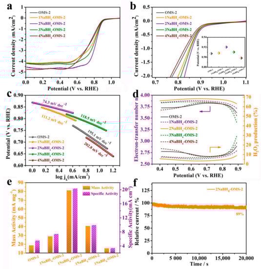 (a,b) Linear sweep voltammetry curves (1600 rpm and 0.005 V s−1), (c) Tafel plot, (d) Electron transfer number and hydrogen peroxide yield, (e) mass specific activity and area specific activity at 0.77 V potential of OMS-2 and OMS-2 treated with different concentrations of NaBH4, (f) i-t of 2NaBH4-OMS-2 at 0.5 V potential.