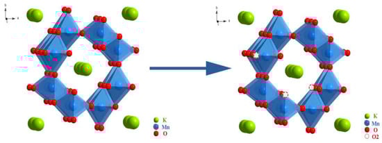 The 2NaBH4-OMS-2 catalyst sample has excellent oxygen reduction performance, indicating that the sodium borohydride treatment plays an important role. The schematic diagram of the formation of oxygen vacancies is shown in Figure 6. For transition metal oxides, the electrocatalytic performance largely depends on the oxygen vacancy content. The generation of oxygen vacancies modulates the electronic structure and surface chemistry of the catalyst, so the effect of oxygen vacancies on performance will be explored from these two aspects.