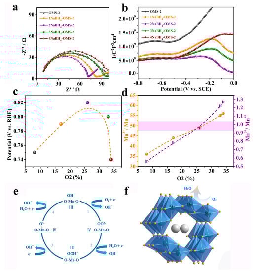 The existence of oxygen vacancies modulates the electronic structure of the catalyst material, and it also affects the electrical conductivity of the material. Figure 7a shows the electrochemical impedance spectroscopy (EIS) of the catalyst. As the content of oxygen vacancies increases, the radius of the low-frequency region first decreases and then increases. An appropriate amount of oxygen vacancies can adjust the resistance of the material itself to a certain extent, which can promote the transport of electrons in the oxygen reduction process and improve the oxygen reduction activity. To further explore the change in conductivity, the material was tested with Mott-Schottky (M-S) curves (Figure 7b). It can be judged that the material is an n-type semiconductor by the positive slope of the M-S curve. The lower slope of the curve reflects the higher carrier concentration of the material, and 2NaBH4-OMS-2 also has a higher carrier concentration. The appropriate surface oxygen vacancy content adjusts the electronic structure of the surface, makes the electron transfer in the oxygen reduction process more rapid, reduces the transport resistance, and promotes the efficient and rapid oxygen reduction.
