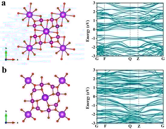 Optimized structure diagram (left) and band structure diagram (right) of (a) OMS-2, (b) OVs-OMS-2.