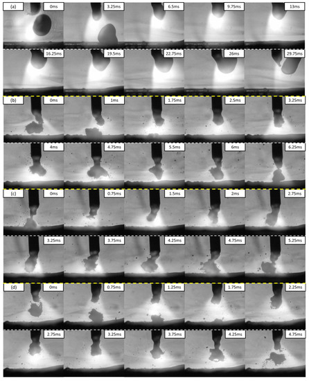 Figure 3. Sequential images of droplet transfer in the medium current range for (a) Wire 1, (b) Wire 2, (c) Wire 3, and (d) Wire 4.