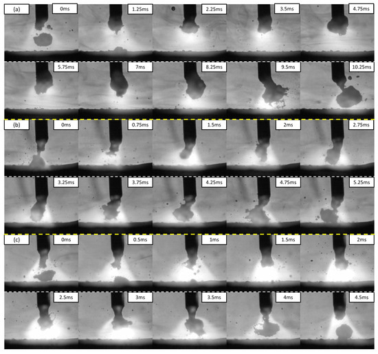 Figure 4. Metal transfer behavior of Wire 3 in the (a) low current range, (b) medium current range, and (c) high current range.