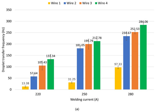 Figure 5a shows the metal transfer frequencies of all four wires. The values in this graph are the average frequency from five measurements, while the error bars indicate the standard deviation. Here, it can be seen that the droplet transfer frequency increases with both the flux ratio and the welding current. In the low welding current range (220 A), the minimum transfer frequency of Wire 1 was 13.38 Hz. This frequency increased to 57.64 Hz, 105.43 Hz, and 133.34 Hz for Wires 2, 3, and 4, which have flux mass ratios of 10%, 15%, 20%, respectively. In the medium current range (250 A), the transfer frequency of Wire 1 (31.25 Hz) was much lower than those of Wires 2, 3, and 4 (181.05 Hz, 199.79 Hz, and 212.78 Hz, respectively). Although the transfer frequency of Wire 1 increased significantly (to 97.33 Hz) in the high current range, the transfer frequencies of Wires 2, 3, and 4 (234.67 Hz, 252.53 Hz, and 284.06 Hz, respectively) did not increase accordingly. These results indicate that the effect of flux ratio on droplet transfer frequency is most significant in the low current range.