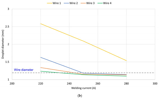 Figure 5b shows the diameter of the molten metal droplets produced by all the wires, calculated based on the melting velocity and the transfer frequencies shown in Figure 5a. This figure indicates that Wire 1 exhibited globular transfer in all welding conditions. In contrast, globular transfer was only observed with the metal-cored wires at the low welding current (220 A); spray transfer was observed at medium and high currents. The image thus indicates that the droplet diameter decreases when the welding current increased or the flux ratio is increased.