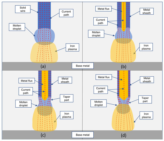 A schematic of the four wires at 250 A is presented in Figure 6 for explanation of the influence of the flux ratio on metal transfer behavior. The current flow inside Wire 1 is thought to be uniform, as shown in Figure 6a. Conversely, in the metal flux-cored wires, due to the low electrical conductivity of the flux [24], current flow is concentrated to the metal sheath of the wire, as shown in Figure 6b–d. Hence, the current density is higher in these wires than that in the solid wire.