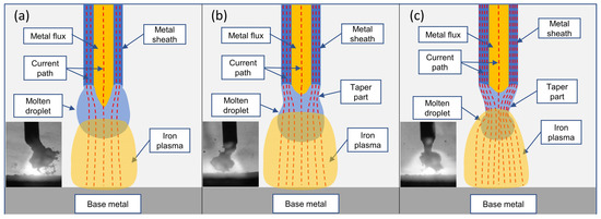 Figure 7 presents a schematic explanation of the effect of welding current on the metal transfer behavior of a metal flux-cored wire with a flux ratio of 15%. Figure 7a shows that at low currents, the arc is concentrated at the bottom of the droplet. Here, we assume that the flux column inside the wire occupies a significant portion of the droplet. Furthermore, the current intensity at the neck of the droplet was not high enough to induce rapid detachment. An actual image of this scenario is presented in Figure 4a at 9.5 ms. Figure 7b explores the scenario when the current was 250 A. Here, the arc moves upward and attaches to the droplet at a higher position. Thus, the molten metal tapers slightly at the tip of the wire, as observed in Figure 4b at 4.25 ms. Finally, at 280 A, the arc completely covers the droplet, as shown in Figure 7c. In this case, the taper in the molten droplet is sharper, as demonstrated in Figure 4c at 3.5 ms.