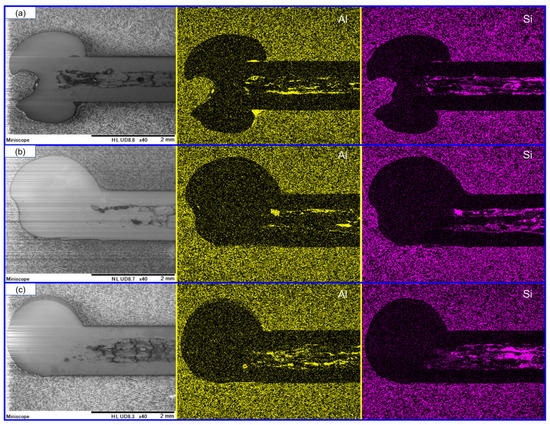 Figure 8. Longitudinal section of Wire 3, distribution of Al, and Si following welding at (a) 220 A, (b) 250 A, and (c) 280 A.
