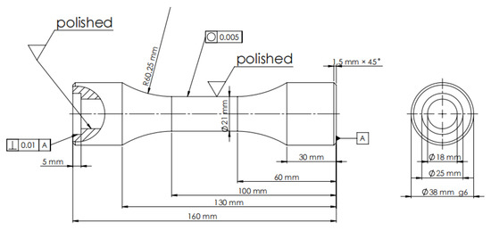 The material used as the research material was AlMgSi1 alloy with a round cross-section. The test was carried out based on the consideration of the introduction of the material characteristics and the technical use of the material. For fatigue testing, a cylinder with a wall thickness of 1.5 mm was used (stress concentration factor K = 1). The inner and outer sides were finely polished. For fatigue testing, a hollow cylindrical specimen with a wall thickness of 1.5 mm was used (stress concentration 1). The cylinder bore had a diameter of 18 mm. The inside of the test object was carried out by honing, while the outside was sanded and finely polished to eliminate the effects of stress concentration arising from machining, and as much as possible to produce a shiny smooth surface so that microcrack observations could be made. The dimensions of the fatigue specimen are shown in Figure 4 and the polished specimen with a total length of 160 mm is shown in Figure 4. The smoothness of the inner surface is equally important so that the surface is notch-free. If this is neglected then the drill trace will dominate and cracks may develop on the inner wall so that it cannot be observed. Drilling results in a deeper imprint than smooth turning of the surface, so further deep surface machining is required.