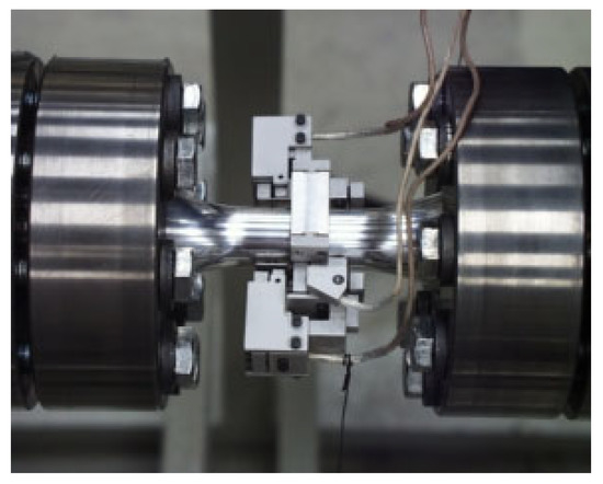 The devices are interconnected with the PC and the control unit. This equipment allows the application of a wide variety of loadings. The measured values are recorded through two load cells, two inductive displacement sensors (integrated in the servo-hydraulic cylinder), a torque sensor, and a multi-axis strain displacement sensor (Figure 5), which is passed on to the test bench PC with an integrated analog–digital card.