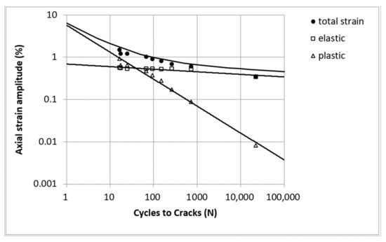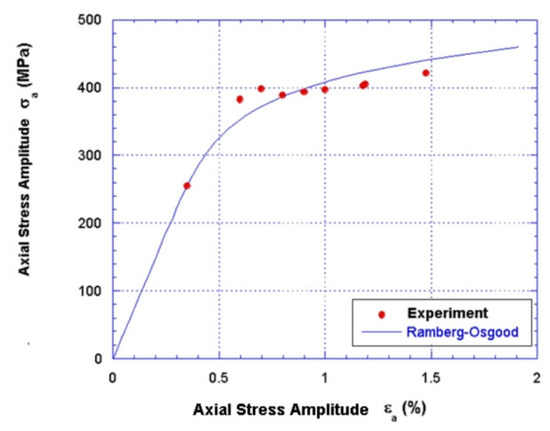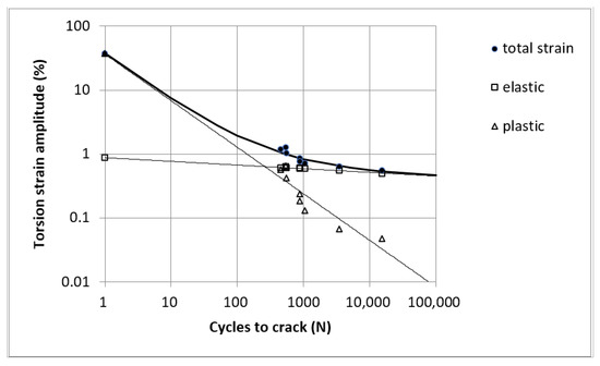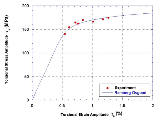 The dynamic stress–strain diagram describes the relationship between the stress and strain amplitudes under cyclic loading at one stress level under saturation conditions. From the obtained hysteresis results, the tensile strain, shear strain, tensile stress, and shear stress can be calculated. From these data, the cyclical Ramberg–Osgood and Coffin–Manson characteristics can be determined. These characteristics are given in Table 3. Axial stress–strain diagrams and strain life diagrams are given in Figure 6 and Figure 7, while torsional stress and strain diagrams and torsional strain life diagrams are given in Figure 8 and Figure 9. The fatigue test showed that under axial compression tensile loading and torsional loading there was no effect of strain hardening or strain softening.