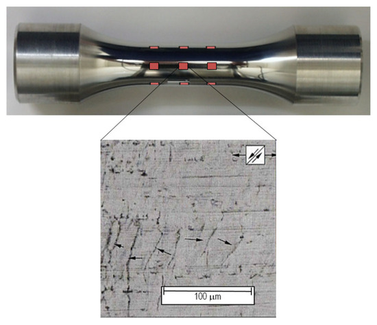 The accuracy in predicting the ages of components that are subjected to fatigue loading is still far from satisfactory. The causes of deviations between the calculation results and experimental results include a lack of understanding of the process of the damage mechanism that occurs in the material [1,2]. Research in this field has identified that at low loading most of the component life is used for the crack initiation phase [3], while at high loading the component life is used for the crack propagation phase [4,5]. Crack initiation and growth in the early stages are strongly influenced by the microstructure of the material [6,7,8]. To determine the effect of microstructure on the damage process, a study was carried out on an early stage damage due to fatigue loading.