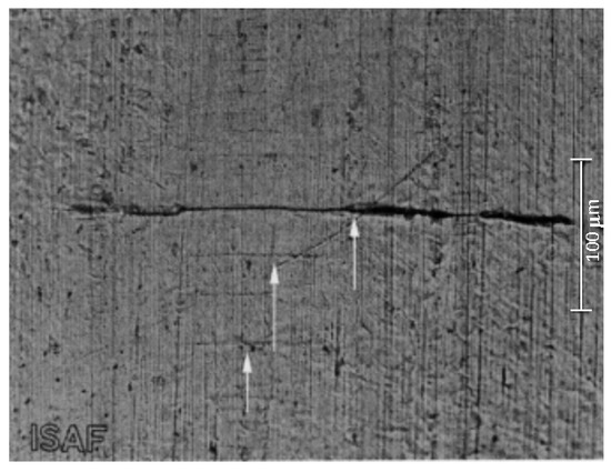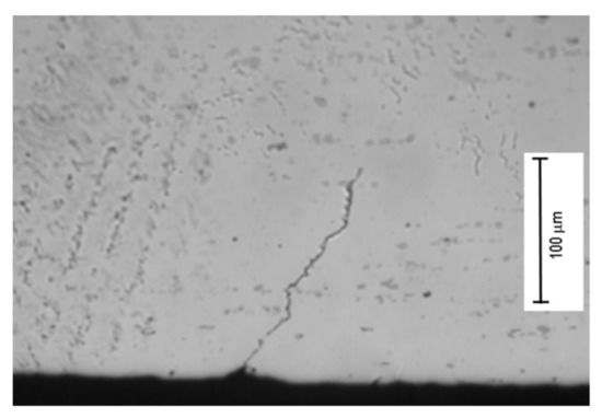 Figure 11 shows cracks that propagate on the surface. The crack propagates well on the surface (type A crack) but also propagates towards the depth (type B crack) [19], as shown in Figure 12.