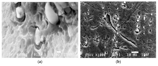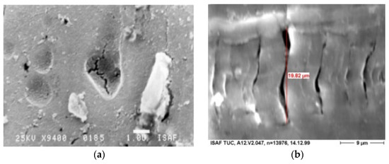 SEM image of the surface of the test object due to torsion load, γa = 0.55%, N = 13,976. (a) crack initiation starting from the position of the particles; (b) torsion cracks.