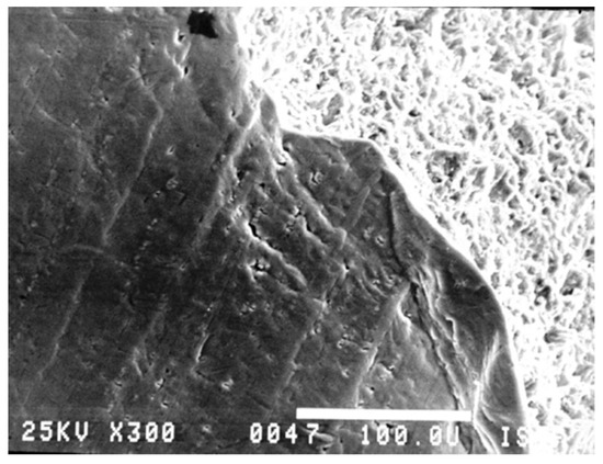 Results of SEM photo of the surface of the test sample, compressive tensile loading with microcracks near the fracture surface, εt = 0.6%, N = 100.