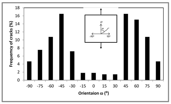Under tensile loading, the direction of the maximum shear stress is shown in Equation (5). From the results of the stress calculations, the direction of the maximum shear stress is 45°. The distribution of cracks under compressive tensile loading in the experiment spreads at all angles, with a tendency toward a direction parallel to the direction of the shear stress, which is ±45°.