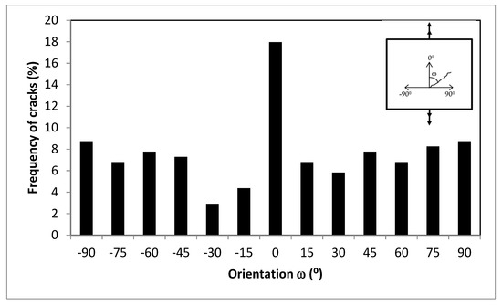 In accordance with the laws of the mechanics of the materials, the loading caused by external forces will cause tensile and shear stresses to the material, which will be transferred to each grain. In the case of tensile loading, the maximum shear stress occurs at an angle of 45° to the direction of the tensile stress and has a magnitude of 1/2 of the tensile stress. Under tensile loading, the maximum shear stress direction is 45°. The distribution of cracks under compressive tensile loading in the experiment spreads at all angles with a tendency toward a direction parallel to the direction of the shear stress, namely ±45°. Figure 10 and Figure 14b show the microcracks of the specimen under fatigue tension compression loading. The microcracks and their orientations are counted and presented in Figure 17. In torsional loading, the directions of the maximum shear stress are 0° and 90°, and the cracks that occur appear to follow those directions (see Figure 11 and Figure 13). The microcracks distribution is shown in Figure 18.
