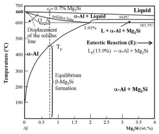 The simulation and modeling were conducted for the purpose of deepening the understanding of the properties of the phases by combining the mechanical and metallurgical perspectives. The focus was on the load capacity and favorable failure conditions based on various failure laws for different constituents. In this study, representatives of the microstructures of aluminum phases were selected. Aluminum AlMgSi1 was used as the basis for the evaluation. The calculated modeling was based on AlMgSi1, but the developed method should be applicable to other similar metals. The Al–Mg–Si alloys, being the alloys of choice for medium-strength architectural and transportation applications, feature most prominently in the automotive industry. The two main alloying elements Mg and Si were included in small amounts (≈1%) to form hardening precipitates, which typically contribute a five-fold strength increase over pure aluminum [22,23,24]. There is a handful of discovered metastable phases in the Al–Mg–Si system alone. Precipitates form during aging at medium to high temperatures (around 150 °C) after solution heat treatments (around between 400 and 500 °C). Then, rapid cooling ensures a supersaturated solid solution (SSSS), after which the solutes start clustering in the face-centered cubic Al lattice. The strength is caused by a high number and density of nano-sized, needle-shaped β” precipitates, usually together with Guinier–Preston (GP) zones. With increasing temperature and aging time, the number density decreases while the precipitates coarsen and are replaced by more stable types. Alloys on the ternary Al-Mg-Si system with the addition of Cu, Fe, Mn, and Cr, among others, possess a precipitation sequence where the supersaturated solid solution is rich in non-equilibrium vacancies that enable a passage through a series of metastable precipitates towards the equilibrium, described as SSSS → clusters → β″ → β′→ β [8,9,10]. There is also a possibility that the coarse Mg2Si (eutectic) is formed in the AlMgSi alloy. Figure 20 shows a diagram illustrating the possibility of forming coarse eutectic Mg2Si under non-equilibrium conditions. While a more in-depth discussion of each ingredient is not included, the primary factors that influence the load-carrying capacity are briefly reviewed for the reader’s convenience.