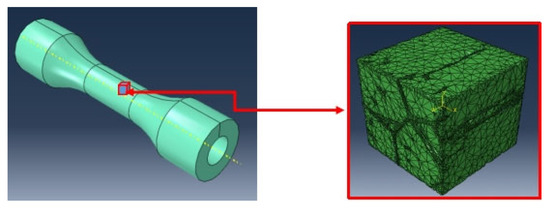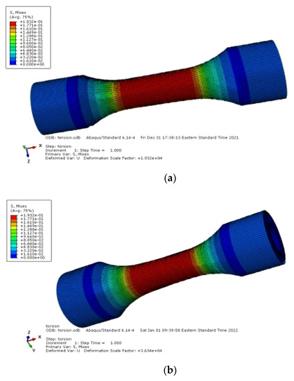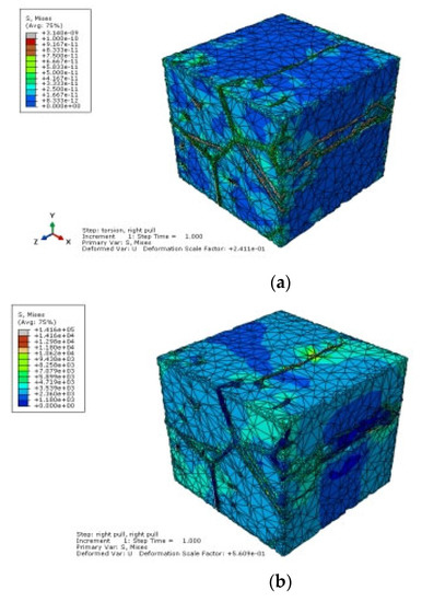 The global model’s results are displayed in Figure 21. The assumption behind this model is that the material is homogeneous. The local models are inserted right at the surface. The findings of the static analysis or stress distribution when the sample is subjected to slow and small loading or when the sample is in a static condition, where stress does not cause any damage, are shown in Figure 22 and Figure 23. These conditions show the difference between tension and torsion when they are implemented separately. Although the stresses concentrate around the hard elements, the figures indicate that at low stress levels, they are not harmful. We note the fact that Figure 23 in reality is modeling one unit cell consisting of only one grain. In Figure 23, the unit cells were simply loaded with tension (Figure 23a) and torsion (Figure 23b). It shows the stress distribution within the unit cell. Also note that despite their simple loadings, the distribution within the unit cells is obvious. In Figure 23a, the stress is concentrated on and around the grain boundary, while that does not happen in Figure 23b.