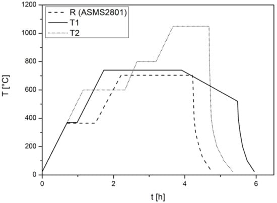 Temperature vs. time plots for the investigated post-processing T1 (740 °C), T2 (1050 °C) and R (704 °C) heat treatments.