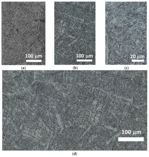 Optical micrographs of the heat-treated Ti-6Al-4V produced by SLM: (a) T1 condition; (b,c) T2 condition; (d) is an enlargement of (b).