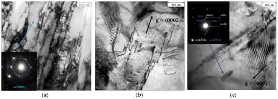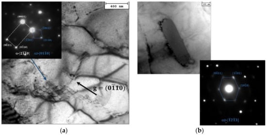 A further important microstructural feature was the presence of tangled dislocations inside α′ phase. These were observed to slide preferentially along the α′-(0002) crystallographic direction, as reported in Figure 4b. A noticeable fraction of the structure was indeed constituted by α′ martensite, as also reported by other authors [,,].