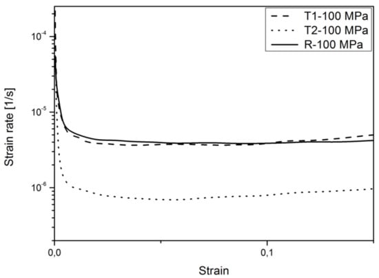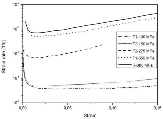 Strain rate vs. strain creep curves: representative curves for the three investigated conditions.