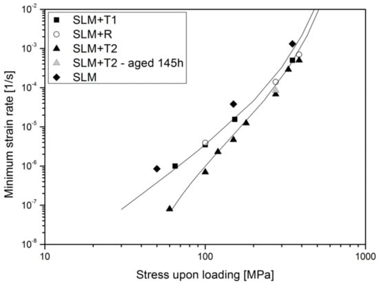 This evidence was fully confirmed when plotting the minimum strain rate as a function of initial applied stress (Figure 7, which also shows two curves, whose genesis will be described in a following Section). Again, the data obtained by testing the samples in T1 and R states overlapped on the same curve, while the minimum creep rates for the T2 samples were substantially lower, in particular in the low-stress region. For comparison purposes, Figure 6 also plots the data obtained in [] by testing another alloy produced by SLM in as-deposited state. In this case, the minimum creep rates were closer (actually a bit higher) than those for the annealed state, which implies that α′-martensite does not creep much differently with respect to equilibrium α-phase. Last, but not least, Figure 7 shows another interesting result, since, in the case of the T2 state, the minimum creep rate was only marginally affected by a previous long (145 h) permanence at high temperature before loading.