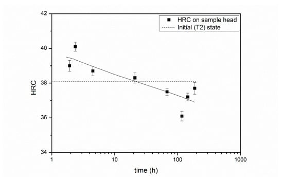 HRC variation and standard error with time of exposure. Hardness was measured on the heads of the crept samples to investigate the possible aging/over-aging in almost unstressed portions of the specimen.
