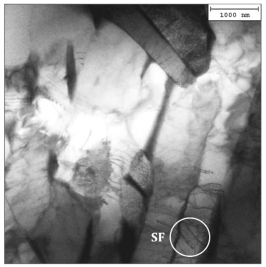 The basket-weave morphology microstructure of the alloy exposed at 650 °C, as observed in an almost unstressed portion of the sample (the head), is shown in Figure 9. This structure consisted of coarser lamellar α-phase, with some α′-martensite colonies, and needle-like β-phase. The lateral width of the α phase was larger in this case with respect to the measured width of the initial microstructure (see Figure 4a). The basket-weave structure was characterized by a sequence of α and β lamellae meeting at angles in the range of 50–75°. The α and α′ phases had parallel geometric orientations and the same grain orientation. At the interfacial region between the α′ and α laths, many dislocations were generally formed due to a local strain accommodation followed by both β-α and β-α′ transformations. Figure 9 also shows some stacking faults (SFs) formed within the α lamellae.
