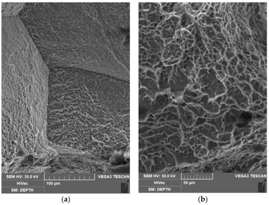 Scanning electron microscopy (SEM) was used for the fractographic analysis of the crept rupture surface. The observations were carried out with a Tescan Vega 3 (Tescan, Brno, Czech Republic) scanning electron microscope using an accelerating voltage of 30 KeV.