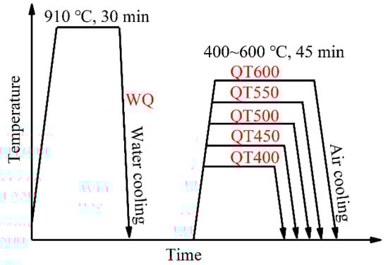 The chemical composition of the low-carbon low-alloy steel is presented in Table 1. The steel was vacuum-melted and cast into a 25 kg ingot, which was reheated at 1200 °C for six hours and forged into a 70 mm thick plate. The forged steel plate was then hot-rolled to 14 mm thickness. The heat treatment process is displayed in Figure 1. The steel specimens were first austenitized at 910 °C for 30 min and then water-quenched (WQ) to room temperature. The specimens were separately tempered at 400 °C, 450 °C, 500 °C, 550 °C and 600 °C for 45 min, and then air-cooled. The specimens with different heat treatments were named QT400, QT450, QT500, QT550 and QT600, respectively.