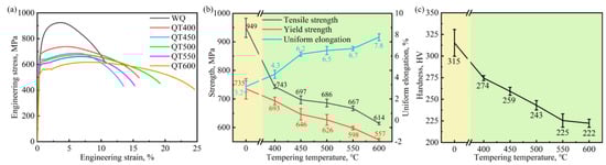 Figure 2 shows the tensile properties of the specimens after different heat treatments. The yield strength, tensile strength and uniform elongation of the water-quenched specimen were 735 MPa, 949 MPa and 3.2%, respectively. Compared with these values, the yield strength, tensile strength and uniform elongation of the specimens tempered at 400 °C decreased by 26 MPa, decreased by 187 MPa, and increased by 1.1%, respectively. The yield strength and tensile strength of the specimens gradually decreased with the increase in the tempering temperature. However, the decrement degree was relatively small. The uniform elongation of the specimens increased continuously with the increase in tempering temperature. The hardness of the water-quenched specimen was 315 HV, whereas that of the tempered specimen at 400 °C decreased by 41 HV. Similar to the strength variation trend, the hardness of the specimens gradually decreased with the increase in tempering temperature.
