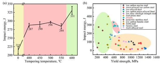 (a) Impact energy of the specimens after different heat treatments, (b) Mechanical property comparison of the experimental steel and other structural steels, including low carbon marine steel [], micro-alloyed low carbon steel [], low-alloyed steel [], low carbon micro-alloyed steel [], low alloy ultrahigh strength steel [], dual-phase steel [], austenitic stainless steel [], low carbon bainitic steel [], E690 steel [], bainitic steel [], multi-alloyed steel [].