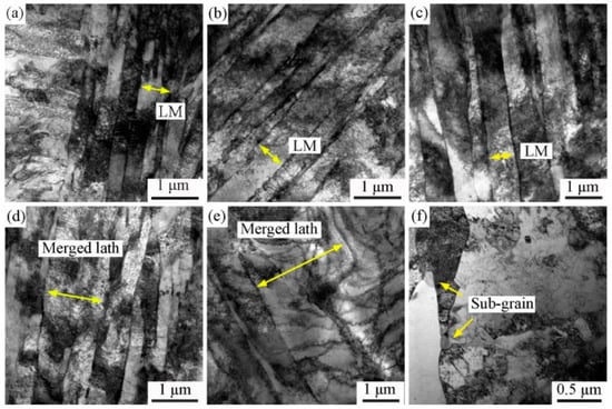 TEM micrographs of different specimens are shown in Figure 5. Figure 5a reveals the presence of numerous dislocation tangles between the martensitic laths, and Figure 5b indicates that the martensitic laths remained straight after tempering at 400 °C. Dislocation offset and annihilation accelerated, and the rate of dislocation proliferation was lower than that of dislocation extinction. When the tempering temperature reached 450 °C, the martensitic laths gradually became bent and tended to merge (Figure 5c). After this, the martensite greatly recovered and maintained its lath-like morphology. Some martensitic laths disappeared, and a part of the remaining laths merged after tempering at 500 °C and 550 °C (Figure 5d,e, marked by yellow arrows). Therefore, the number of dislocations was also substantially reduced due to the fast rate of dislocation extinction, and the remaining dislocations underwent polygonization. When the tempering temperature was 600 °C, sub-grains were formed (Figure 5f, marked by yellow arrows).