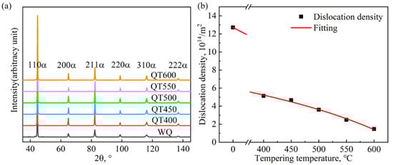Figure 6a displays the XRD patterns of the specimens after different heat treatments, and the peaks are all BCC peaks. The dislocation densities were quantified by evaluating the six peaks, as shown in Figure 6b. The dislocation density of the water-quenched specimen was calculated as 1.27 × 1015 m−2. After tempering at 400 °C, the number of dislocations decreased sharply, and nearly half of these dislocations were annihilated. Thereafter, the dislocation density decreased slightly during tempering at 450~600 °C.