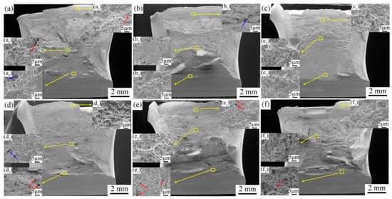 Figure 7 shows the impact fracture morphologies of the specimens after different heat treatments. In the sub-figures, as shown by the yellow arrow, Figure 7(a1–f1) are the bottom magnification of the specimens, Figure 7(a2–f2) are the central magnification of the specimens, and Figure 7(a3–f3) is the near notch magnification of the specimens. It is noticeable that all specimens mainly experienced a ductile fracture. The fracture surfaces were composed of a large number of dimples of uneven size, depth and shape. Microvoids existed on the fracture surface of the specimens, especially at the bottom of the dimples, as shown by the red arrows. Cracks were formed by the continuous development of microvoids under stress during the impact test, as shown by the blue arrows in Figure 7(a3,b1,d2). In addition, the size of the dimples shown Figure 7a differed greatly, whereas the dimples shown in Figure 7b–f almost had a similar size.