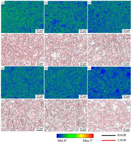 Kernel average maps and grain boundary distribution maps of the specimens after different heat treatments. (a,d) WQ, (b,e) QT400, (c,f) QT450, (g,j) QT500, (h,k) QT550, (i,l) QT600.