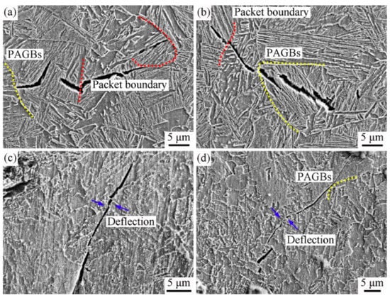In order to investigate the mechanism of crack initiation and propagation in detail, the surfaces perpendicular to the impact fracture were observed. The water-quenched and 600 °C tempered specimens were selected to explore the influence of different microstructures on crack propagation. Figure 9a,b show the crack propagation path in the homogeneous martensite of the water-quenched specimen after the impact test. When the crack encountered prior austenite grain boundaries or packet and block boundaries, it tended to turn to another propagation direction (marked by yellow dotted lines) or stop propagation (marked by red dotted lines). The crack propagation path between martensitic laths was relatively straight, mainly travelling along lath boundaries or directly through laths in order to continue to propagate, until it passed through the whole grain and stopped at the prior austenite grain boundaries or packet and block boundaries. Figure 9c,d show the crack propagation path in the tempered martensite of the specimens after tempering at 600 °C. Cracks were deflected multiple times at the packet and block boundaries (marked by blue arrows). Therefore, the propagation behaviors of cracks in the homogeneous martensite and tempered martensite were similar.