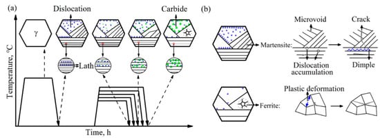 Tempering was carried out to achieve the optimal combination of strength and toughness by toughening []. A schematic diagram of the microstructures of the specimens after different heat treatments is shown in Figure 10a. The microstructure of the specimen after water-quenching mainly consisted of martensite. The merging, coarsening and decomposition of martensite occurred after tempering from 400 °C to 600 °C. The reason for this was that a large number of dislocations were present in the martensite, and the martensite was a metastable phase and supersaturated solid solution []. The increase in tempering temperature provided energy for atomic diffusion, and the further diffusion of carbon (C) atoms made the prior austenite grain boundaries and martensitic lath boundaries become the main C atom segregation areas. In addition, C atoms were also prone to migrating to dislocations and interact with dislocations to reduce lattice distortion, thereby reducing the system energy and making the system more stable [,,,].
