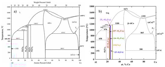 - McAllister, A.K. The Al-Co (Aluminium-Cobalt) system. Bull. Alloy Phase Diagr. 1989, 10, 646–650. [Google Scholar] [CrossRef]