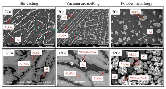 SEM images (backscattered electron mode) for Al-7 wt % Co (7Co) and Al-32 wt % Co (32Co) fabricated by stir casting, vacuum arc melting and powder metallurgy (Reprinted with permission from [34,72]. Copyright 2022, Elsevier).