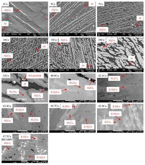 Microstructures (SEM, backscattered electron mode) for Al-Co alloys with different Co compositions (wt % Co) fabricated by vacuum arc melting [72,78,79,80] (Reprinted with permission from ref. [72,79,80]. Copyright 2022, Elsevier).
