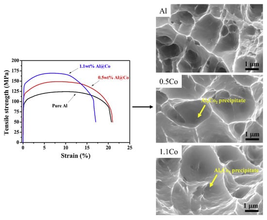 Tensile testing curves for Al, Al-0.5 wt % Co and Al-1.1 wt % Co fabricated by additive manufacturing and associated images of the fractured surface of tensile bars under SEM (Reprinted with permission from [37], Copyright 2022, Elsevier).